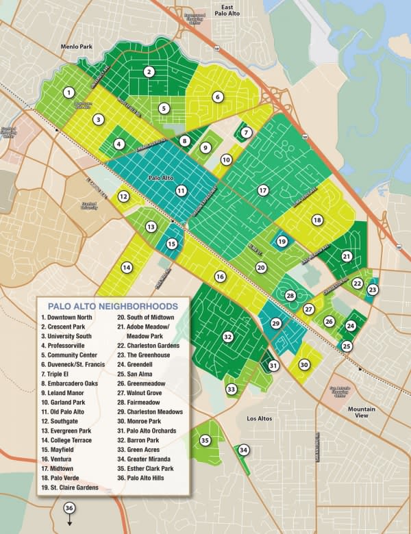 Palo Alto has about three dozen neighborhoods, with distinct names, layouts and vibes.